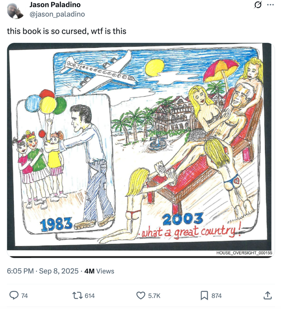 And that still wasn’t all. In yet another birthday drawing released by the House Oversight Democrats, the artist depicts Epstein in 1983 (when he was 30, mind you) handing lollipops and balloons to four girls. In the second panel, depicts Epstein that year getting massages from four barely clothed women. Normal! But, wait, that location looks familiar…